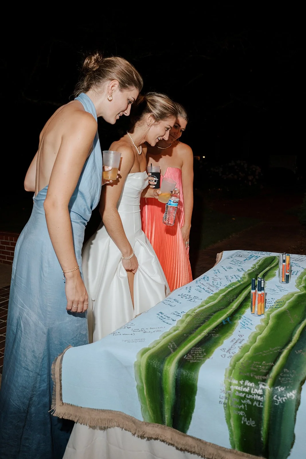 Instead of a traditional book, I created a painting — a piece of art that could live in our home as both decor and a memory. The inspiration was from another Dallas-based artist who did something similar for her wedding. I knew instantly it was something I wanted at ours. I spent months working on the piece, to bring a little Texas to Georgia for the event. During the reception, our guests signed it with their names and notes, each mark layering more meaning into the piece.